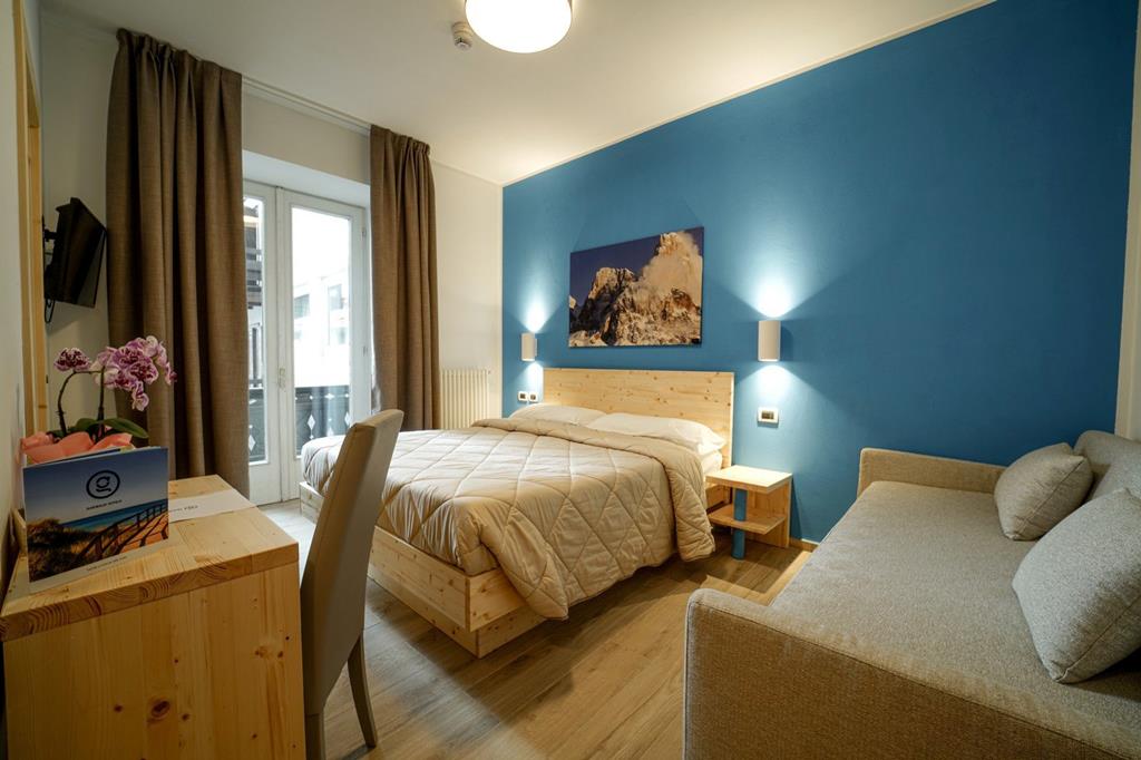 Fijn aan dit hotel is dat je aan de voorkant zo het centrum inloopt. En aan de achterkant een weids uitzicht op de bergen hebt. Groot voordeel van een wintersport in dit land is natuurlijk de lokale keuken. Geen gefrituurde schnitzels tijdens het diner, maar verfijnde pasta’s en goede wijnen. De skilift ligt op 800 meter en voor wellness wandel je naar de spa vlakbij.